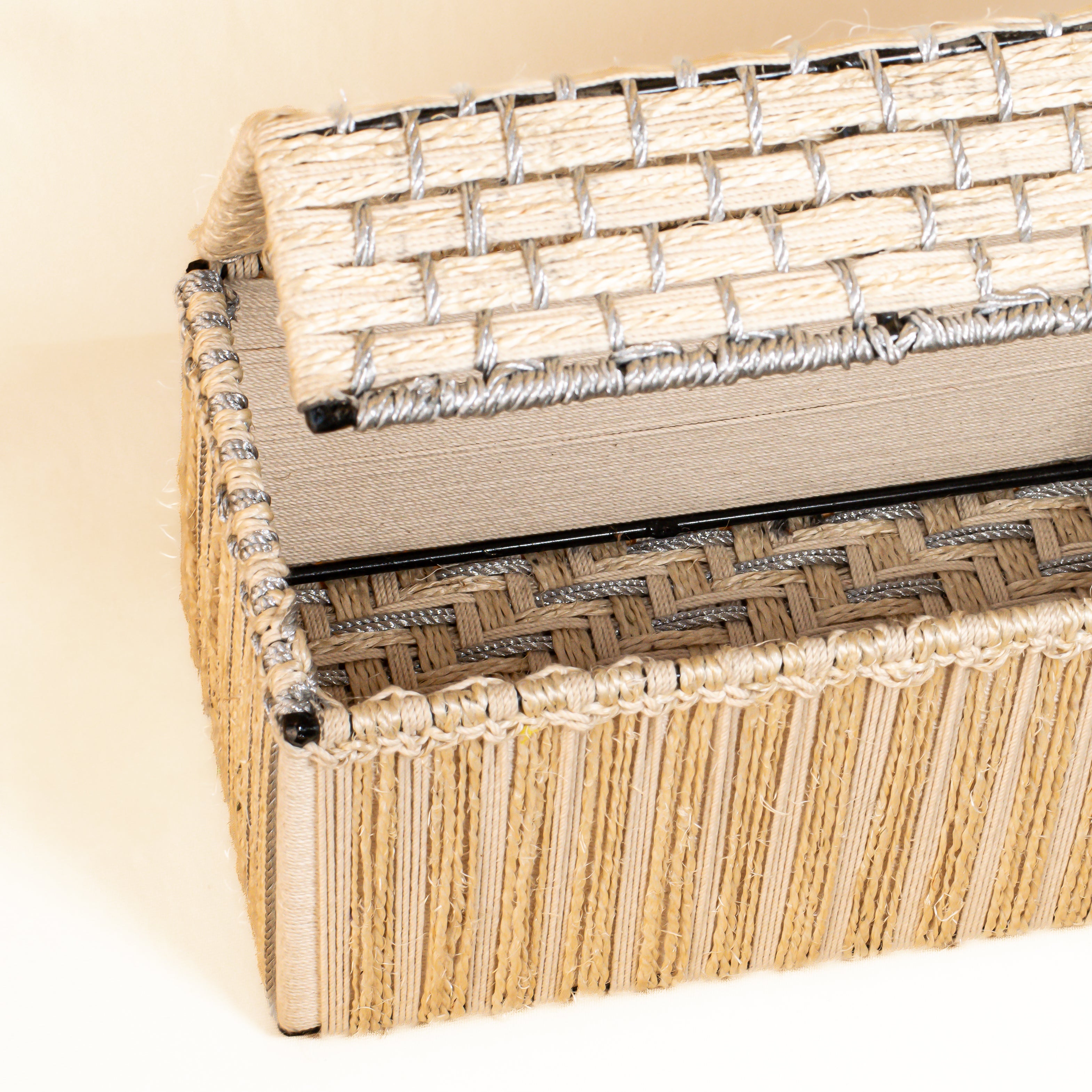 Experience the perfect blend of serene elegance, timeless craftsmanship, and sustainable design with this handwoven storage box crafted from premium resham and cotton fibres. Made with care by Sirohi’s skilled women artisans, it is ideal for organising essentials, creating premium gifting hampers, trousseau curation, or adding a sophisticated decorative accent to your home. Durable, artisanal, and consciously crafted, it brings refined charm and mindful luxury into every space.