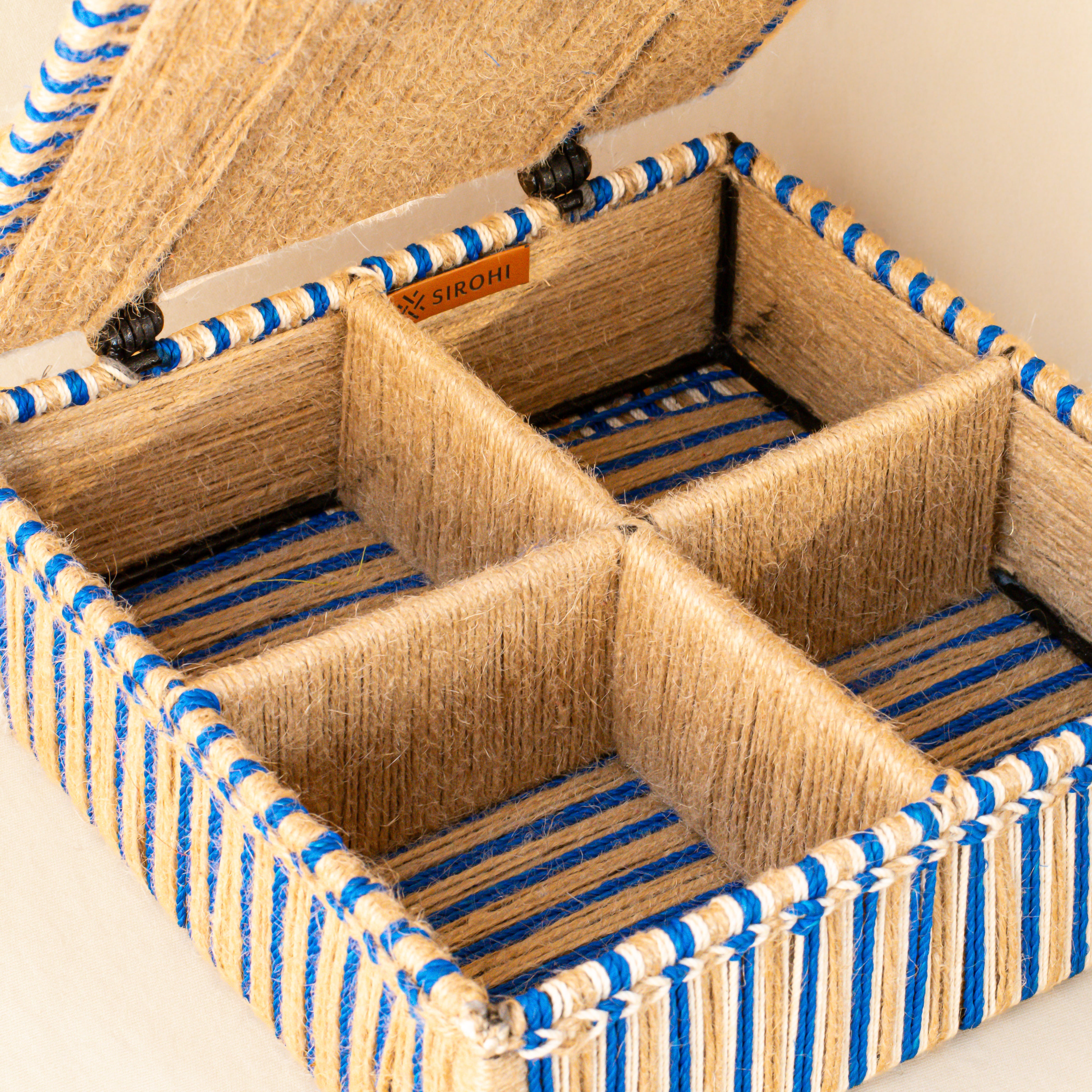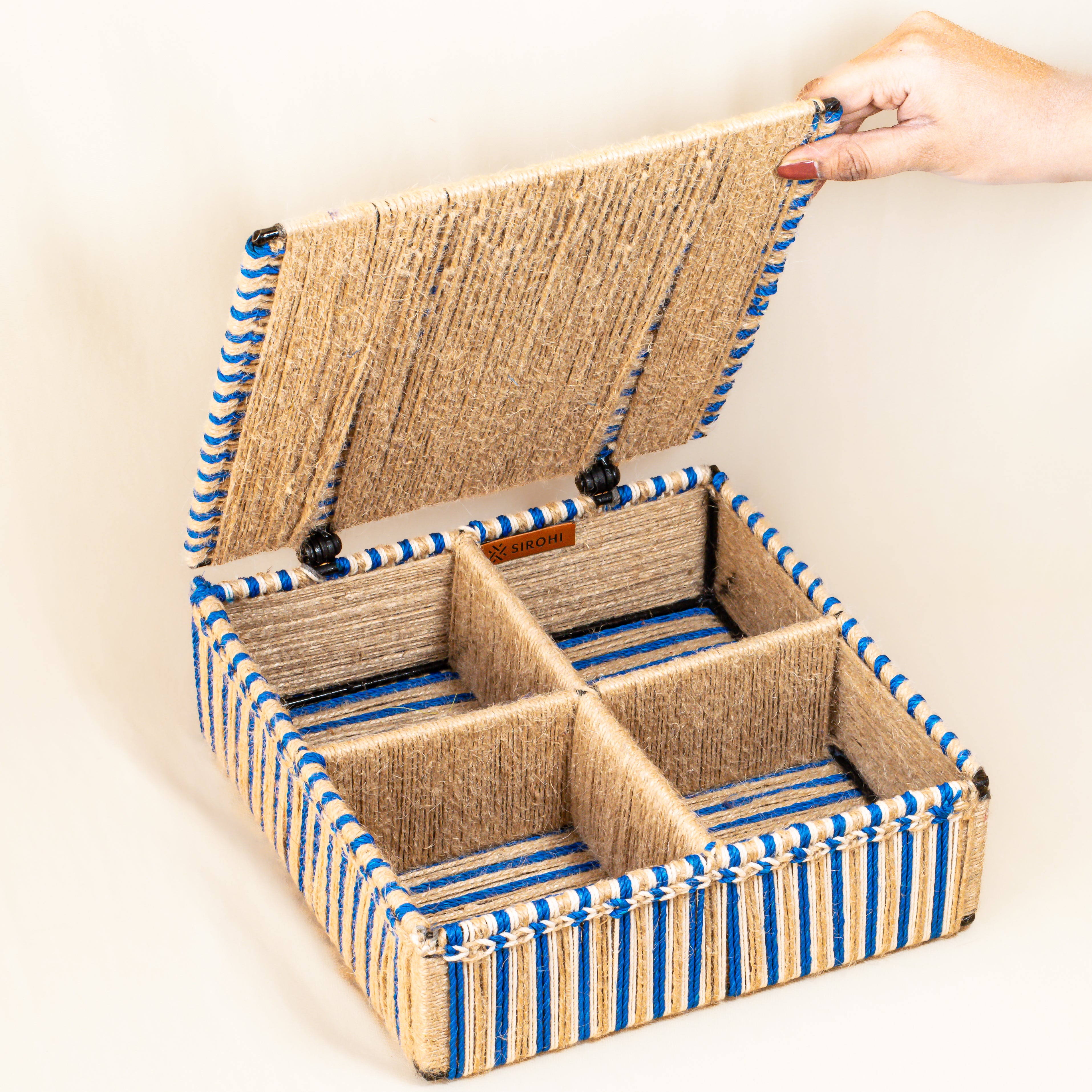 Experience the perfect blend of natural texture, refined craftsmanship, and sustainable design with this handwoven storage box crafted from jute, cotton rope, and smooth resham fibres. Thoughtfully made by Sirohi’s skilled women artisans, it offers a versatile and elegant solution for organising essentials, premium gifting, trousseau packing, or enhancing your home décor. Durable, artisanal, and consciously created, it brings timeless charm and mindful luxury into any space.