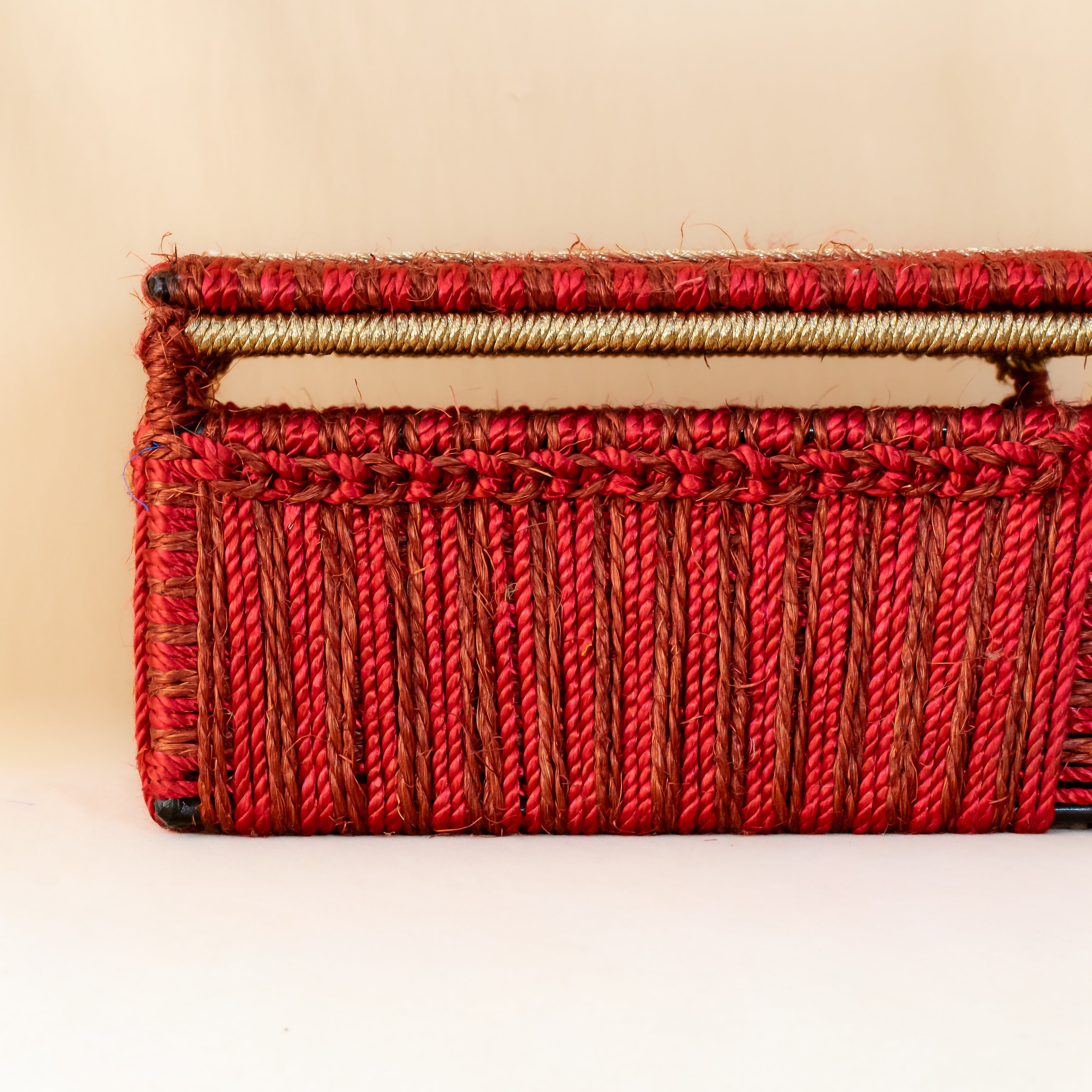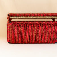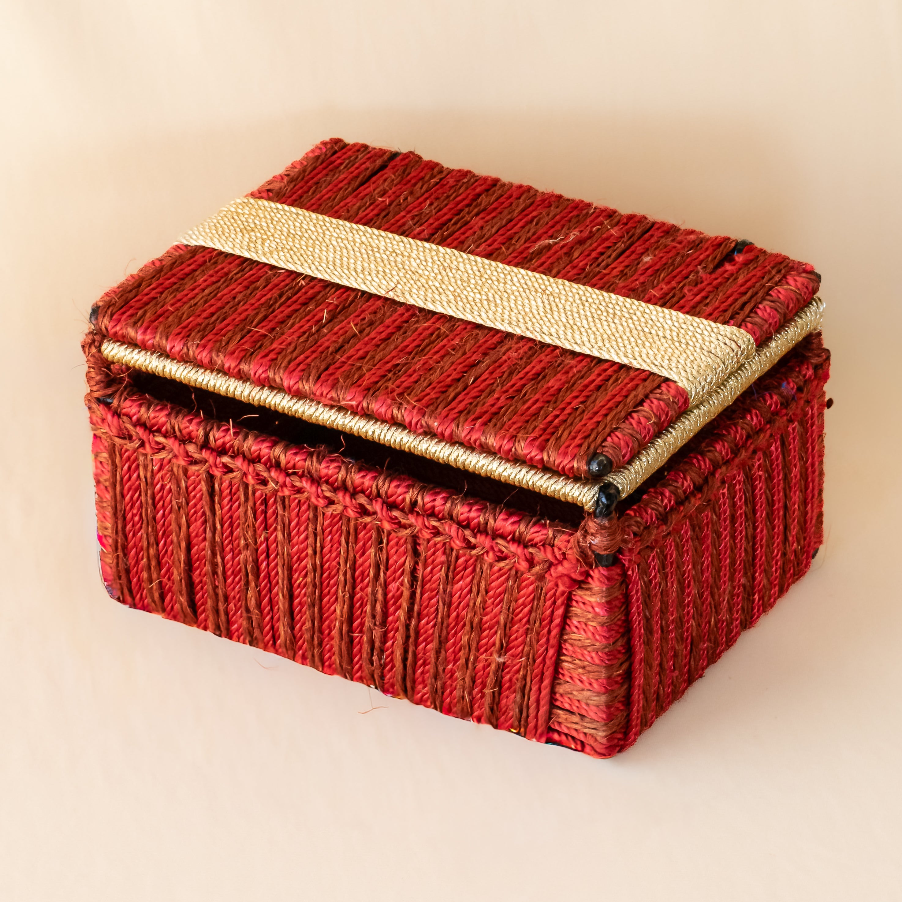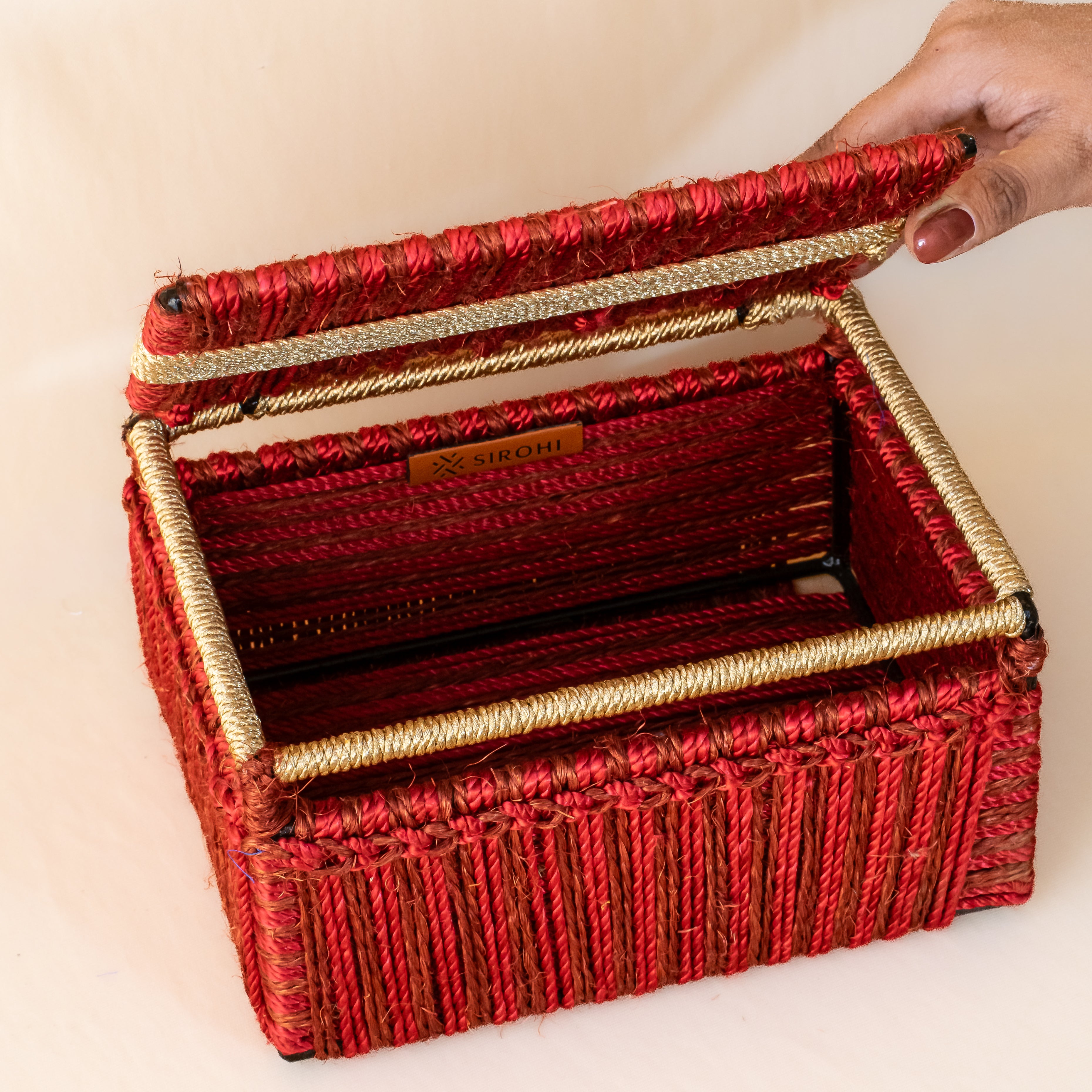 Experience the perfect blend of festive luxury, rustic charm, and sustainable craftsmanship with this handwoven box set crafted from rich resham rope in gold, deep red hues, and durable nyett fibres. Made by Sirohi’s skilled women artisans, each box offers a refined, premium feel, ideal for organising essentials, festive gifting, trousseau packing, or elevating home décor. Thoughtfully designed, durable, and eco-conscious, this set brings artisanal elegance and mindful living into any space.